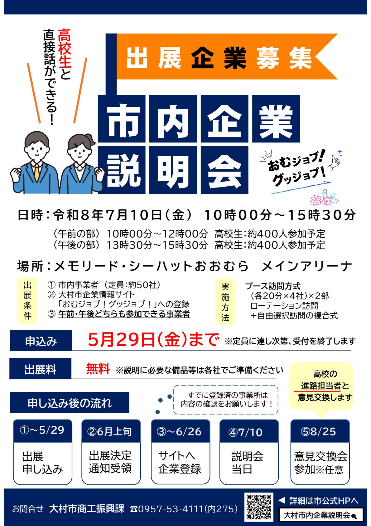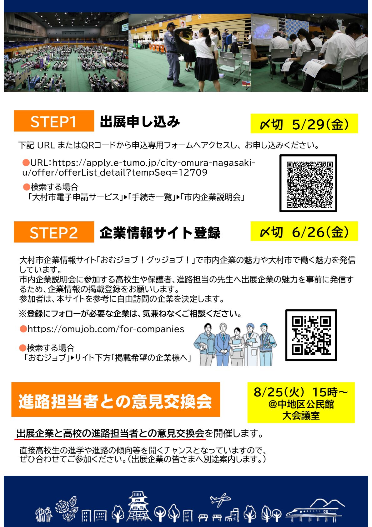 - 本説明会に出展いただく企業と高校進路担当教員とが意見交換できる場として「大村市若者定着官民連携会議(8/25)」を開催します。